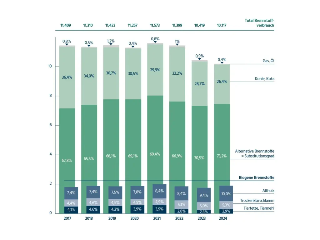 Die Abkehr von fossilen Brennstoffen stellt eine vielversprechende Möglichkeit dar, die CO2-Emissionen signifikant zu senken. Bereits über 70 Prozent des Brennstoffbedarfs substituiert die Schweizer Zementindustrie mit Alternativen. Wie oben aufgezeigt, sind Brennstoffe eine der Hauptquellen von CO2-Emissionen bei der Zementherstellung. Alternative Brennstoffe, wie Kunststoffe, Altreifen, Biomasse und andere organischen Materialien eignen sich hervorragend als Energiequelle für die Zementherstellung. Die Verwertung dieser Abfälle geschieht sowohl stofflich als auch energetisch, was hilft Ressourcen zu schonen, Emissionen zu vermeiden und Abfälle ohne Rückstände und wirklich sinnvoll zu nutzen.