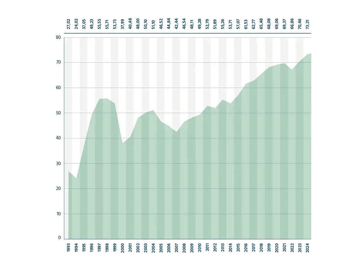Im Jahr 2024 wurden in der Schweiz 4’021’692 Tonnen Zement verbraucht. Dies entspricht einem Pro-Kopf-Verbrauch von rund 450 Kilogramm. 3,56 Millionen Tonnen Zement wurden durch die Schweizer Zementindustrie geliefert. Mit 17,1 Prozent steigt der Anteil des importierten Zements im Vergleich zum Vorjahr weiter an. Die sich nur langsam erholende Konjunktur, die wirtschaftspolitisch unsichere Lage und die eher hohen Energiepreise zeigten sich auch in den abnehmenden Zementlieferungen. Ende 2024 ist eine Trendwende festzustellen, welche auch für das laufende Jahr verhalten zuversichtlich stimmt.